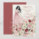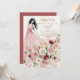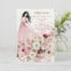 This invitation stands out for its sophisticated watercolor effect, bringing an artistic, soft, and ethereal feel to the design. The illustration features a full-body woman in a graceful model pose, with dark hair and a delicate, refined presence. She wears a pink tulle dress adorned with flowers that appear to scatter softly in shades of pink, red, and white, accompanied by green leaves that add freshness and balance. The front background is white, allowing every brushstroke to be seen clearly, while the back of the invitation is red, adding warmth and contrast that elegantly complements the illustration without interfering with its artistic details. Every element conveys charm, femininity, and a romantic aura, making this invitation both exquisite and visually captivating.