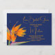 Oiseau de paradis nuptiale invitation à la douche avec fleurs orange. Papier bleu très foncé, orientation horizontale et fleurs exotiques dans le coin inférieur. La police de script est utilisée pour le titre du parti et le nom de l'honoraire. L'oiseau orange des fleurs du paradis est époustouflant sur cet arrière - plan sombre. Achetez une version imprimée avec du papier et des bordures mis à niveau en option, ou choisissez le téléchargement instantané pour partager ces belles invitations numériquement.