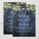 Cette invitation de mariage rustique tout-en-un avec des lumières de corde en bois de grange bleu peut être personnalisée avec vos informations en typographie moderne et les détails du mariage au verso. Conçu par Thisisnotme©