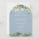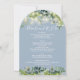 Cette élégante invitation de mariage avec lumières de chaîne botaniques de eucalyptus et bleu poussiéreux peut être personnalisée avec vos informations en typographie chic avec toutes vos informations spéciales de jour de mariage au verso, y compris votre RSVP, hébergement et détails supplémentaires. Conçu par Thisisnotme©