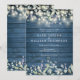 Une invitation de mariage rustique élégante avec de jolies guirlandes lumineuses et des feuilles de sauge et de lilas qui tombent sur un fond de panneaux en bois bleu rustique avec vos détails de mariage dans un texte classique élégant. Conçu par Thisisnotme©