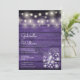 Une élégante faire-part de mariage rustique avec de jolies lampes à cordes et des jarres en maçon. Les noms du couple heureux sont placés dans un script élégant au-dessus des détails mariages spéciaux sur un arrière - plan rustique en bois violet. L'envers est assorti d'un arrière - plan en bois violet rustique. Conçu par Thisisnotme©
