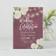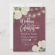L'invitation de célébration de mariage carde le modèle - hortensias blancs floraux et lumières de ficelle sur l'arrière - plan vintage de rouge de Bourgogne.