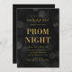 Invitation pour le bal de promo élégante avec les mots "Prom Night" en faux feuillet d'or sur un fond à motif de lumières bokeh foncées. L'invitation a un verso à fond foncé.