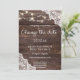 Les choses changent. Envoyez à vos invités un magnifique changement de date de mariage en raison de cette invitation avec dentelle de bois bleu et lumières de guirlande. Idéal pour les mariages champêtres et en plein air.