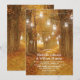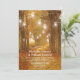 Faire-part de mariage de forêt automnale représentant une forêt automnale rustique avec des arbres couverts de feuilles rouges, orange et jaunes, un cœur sculpté avec vos initiales, des lumières de jarres de maçon scintillantes et un modèle de texte de mariage moderne.