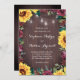 Ces invitations de mariage présentent un design de bordure florale à l'aquarelle avec des tournesols, des roses de Bourgogne et du feuillage sur un fond en bois avec des lumières de corde de pot de maçon. Personnalisez-les avec votre propre texte. Ces invitations font partie d'une collection qui comprend de la papeterie de mariage assortie. Veuillez visiter notre magasin pour voir la gamme complète d'articles que vous pouvez personnaliser pour votre mariage.