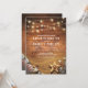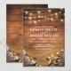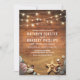 Cartes d'invitation de mariage destination plage avec un fond de grange en bois rustique, lumières scintillantes de ficelle, plage de sable avec une étoile de mer et des coquillages.
