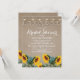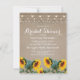 Cartes d'invitation pour une fête prénuptiale de mariage champêtre avec un fond en tissu toile de jute marron, des guirlandes lumineuses, des tournesols d'été de jardin et un modèle de texte de mariage.