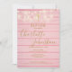 Un baptême rustique ou une invitation à la baptême avec de jolies lampes à cordes, une croix d'or élégante et un nom signature de script sur un arrière - plan de panneaux de bois rose. Personnalisez avec votre baptême spécial ou information de baptême en typographie chic or. Conçu par Thisisnotme©