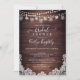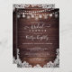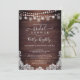 Invitations de douche nuptiale rustique avec bois de grange de pays foncé avec lumières à cordes, lumières de la fête de bocal de mason et dentelle blanche avec typographie manuscrite. Contactez le concepteur via Zazzle Conversation ou makeitaboutyoustore@gmail.com si vous souhaitez modifier ce design, sur un autre produit ou des éléments de coordination.