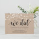 Cette carte d'invitation kraft thème Ferme Rustique (Nous l'avons fait) est parfaite pour votre célébration/annonce de mariage en fuite. Ajoutez vos détails avec une police/lettrine noire assortie.