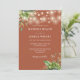 Cette élégante invitation de mariage avec lumières guirlande de verdure de eucalyptus botanique et terre cuite peut être personnalisée avec vos informations dans une typographie chic avec le code QR de votre site web de mariage au verso. Conçue par Thisisnotme©