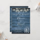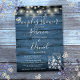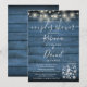 Une invitation à une fête de mariage de couple rustique avec de jolies guirlandes lumineuses et des bocaux en verre avec une typographie élégante, sur un fond en bois rustique bleu. Conçue par Thisisnotme©