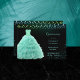 Surprenez tous vos invités avec ce design magique, vert menthe, robe de princesse pour le doux quinze honoré. Des éclats de diamant recouvrent la robe, et des parties scintillant se dispersent dans les coins, sous des lampes à cordes sur l'arrière - plan noir.