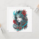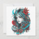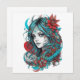 A turquoise moon-kissed maiden blooms beneath a crescent sky. Her flowing cyan hair weaves through crimson hibiscus and ancient henna runes, where midnight florals embrace her luminous blue gaze — a living eclipse of ocean and fire.