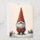 Une charmante illustration d'un lutin festif vêtu d'un chapeau et d'un manteau rouge vibrant, debout dans un paysage enneigé serein. La longue barbe blanche et le nez fantaisiste du lutin dépassent de sous le grand chapeau pointu, évoquant un sentiment de joie des fêtes et de folklore nordique.