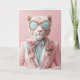 Un chic léopard blanc vêtu d'un somptueux costume rose orné de bijoux, de détails fleuris et d'élégants ornements. Le félin sport des lunettes de soleil rondes et un cravate pastel, qui exsument le raffinement et le glamour.