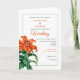 Beau, élégant art floral vintage d'orange Lys avec feuilles verts ; sur un faire-part de mariage blanc plié. Idéal pour les couples qui ne veulent pas envoyer de cartes RSVP séparées car cela vous donne la possibilité de mettre les coordonnées RSVP à l'intérieur, y compris les détails de votre site Web mariage et une photo personnelle