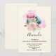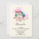 Une invitation d'anniversaire avec une image charmante. 3 macarons colorés, rose, vert et bleu avec un bouquet floral de rose élégant et une touche d'aquarelle rose derrière. Délicieux et élégant aussi !