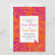 Magenta tropical, monstère orange et or vibrante et faire-part de mariage feuille de palmier. Il présente un motif de feuilles tropicaux magenta fuchsia rose avec contour or et votre texte dans un cadre blanc sur arrière - plan orange vif. L'arrière comprend un motif à points de polka or sur arrière - plan magenta.