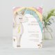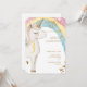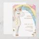 Unicorn birthday party. Yellow, pink and turquoise birthday party invitation. Young girl birthday party invite. Rounded. Rainbow. Magical day. White background.