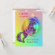 Une invitation magique amusante à la fête d'anniversaire avec un effet pétillant violet Unicorn sautant à travers un arc-en-ciel coloré, si mignon et un favori avec les jeunes filles; il suffit de le customiser avec les détails personnels de votre fête d'anniversaire de fille.