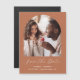 Cette carte magnétique simple et minimaliste Save the Date présente une photo en arc au-dessus des mots "Save the Date" dans un élégant script d'écriture manuscrite blanche, suivie des noms du couple, date mariage et ville en sans serif police sur un arrière - plan en terre cuite.
