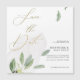 Le design élégant et soyeux présente une branche d'olivier vert, symbole de paix, sur fond d'aquarelle transparente. Cette carte de sauvegarde à jour dans un script de calligraphie or simple fait partie d'un ensemble trouvé dans notre boutique de studios Design Curve. Un magnifique thème Mariage pour le printemps, l'été ou l'automne. Customisez facilement à vos renseignements personnels de votre choix.