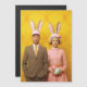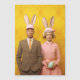 Un homme et une femme rétro avec une expression sérieuse du visage, portant des oreilles de lapin sur la tête et elle tient des oeufs de pâques de couleur pastel