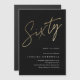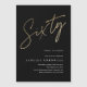 Invitation de fête d'anniversaire 60 ans minimaliste moderne avec un numéro de style en faux or écrit à la main Soixante et les détails de votre fête dans une police serif classique sur fond noir, simple et élégant, grande surprise pour les hommes et les femmes pour cet anniversaire marquant. La couleur de fond noir peut être changée à n'importe quelle couleur de votre choix.