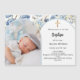 Ajoutez votre propre photo en taille verticale. Un cadre photo en forme d'arche de couleur bleu bébé. Un fond de couleur blanche, décoré de fleurs bleues. Personnalisez et ajoutez un nom et des détails.