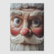 Un gros plan très détaillé d'une figurine de Père Noël avec des yeux larges et expressifs, des joues roses et un nez rouge vif. Les détails texturés de la barbe et de la peau créent une représentation réaliste et fantaisiste, capturant un moment d'émerveillement ou de surprise.