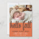 Une annonce de naissance automnale mignonne comporte une photo de votre nouveau-né dans la moitié supérieure. La moitié inférieure est d'une couleur orange épicée profonde. Hello Fall est écrit dans une grande police de caractères cursive moderne de couleur violet foncé. Le nom du bébé est écrit dans le même violet. Sa date de naissance et son état de naissance sont dans un texte blanc simple. Envoyez-moi un message si vous avez besoin de produits assortis.