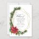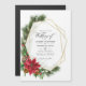 Invitation de mariage magnétique rustique tendance de Noël avec cadre géométrique doré et typographie écriture manuscrite avec clochettes, fleurs de poinsettia, houx, gui et pin.