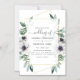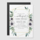 Verdure tendance eucalyptus et fleurs de pavot dans des tons pastel faire-part de mariage avec cadre géométrique or et élégante typographie manuscrite.