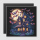 L'image représente une maison hantée stylisée la nuit. La maison est grande avec des toits pointus et plusieurs fenêtres émettant une lueur jaune, suggérant la lumière intérieure. Autour de la maison sont de nombreuses chauves-souris en vol contre un ciel sombre. Au premier plan, il y a un cimetière avec des pierres tombales, ce qui ajoute à l’atmosphère étrange de la scène. Cette image est intéressante en raison de ses éléments thématiques communément associés à l'horreur ou Halloween et sa palette de couleurs vibrantes mais foncées qui donne une humeur éffrayante.