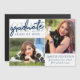 Sophistiqué 2 photo collage style graduation horizontale modèle superposition avec accents dans une palette classique bleu marine et blanc. Le design avant est composé d’un chic script de brosse à lettres "gradué" et de 2 photos, ainsi que du nom, de l’école et de l’année de graduation de la diplômée. Sur le dos, il y a des rayures de complimente et les détails de l'événement. #bound #classof2019