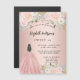 Une invitation moderne, élégante et glamour pour une fête Sweet 16, 16e anniversaire. Un arrière - plan rose en or avec des fleurs roses rousses, une fille portant une robe de bal. Le nom est écrit avec un script de style moderne écrit à la main. Personnalisez et ajoutez les détails de votre fête.