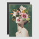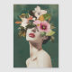 Une oeuvre numérique captivante d'une femme aux fleurs et à la verdure luxuriante qui orne son visage, obscurcissant ses yeux et créant un sentiment de mystère et de connexion avec la nature. Ses traits doux et stylisés contrastent avec les fleurs et le feuillage vibrants, tandis que l'arrière - plan verte riche met en valeur la beauté de sa couronne florale. La composition allie surréalisme et élégance, incarnant une harmonie entre la forme humaine et la nature.