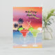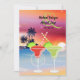 La belle conception d'invitation de mariage présente une scène de plage magnifique avec un coucher de soleil vibrant sur l'océan. Il y a deux margaritas avec des pailles croisées devant le fond qui comprend des silhouettes d'arbres à pain charmants. Personnalisez facilement avec toutes vos informations de mariage.