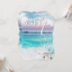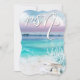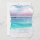 Ciel de lever de soleil rose et lavande avec des nuages floconneux, le lever de soleil commençant tout juste à se refléter sur les vagues de l'océan. Joliment corail, huître ouverte avec perle à l'intérieur accentuant ce design d'invitation. Cadre tropical de bord de mer classe pour ce parfait mariage de plage ou mariage sur une île de destination.