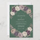 Cette conception présente un riche fond vert profond orné de deux grappes florales luxuriantes. Les arrangements comprennent des roses prune profond et lavande, parsemées de fleurs blanches crémeuses et de feuillage atténué. L'esthétique globale est sombre et sophistiquée, parfaite pour un cadre forestier inspiré de la nature. Les roses aquarelles détaillées et les baies délicates ajoutent une touche de romance au thème botanique atmosphérique.