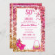 Moderne et élégant, Invitation pour la fête d'anniversaire de la fashionista de 50 ans. Cadre de confettis en faux brillant rose vif luxueux et glamour féminin, une belle paire de talons hauts 👠 avec des nœuds est posée dans le coin gauche et un charmant sac rose doré coloré 👛 est posé dans le coin inférieur droit, script 50 & Fabuleux rose vif fuchsia sur fond blanc. Vous pouvez facilement modifier votre nom et votre adresse, les polices, la couleur, la taille et le numéro d'âge en cliquant sur les options de personnalisation de Zazzle.