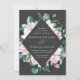Elégantes invitations de mariage florales avec vos détails mariages entourées d'un cadre géométrique de fleurs de magnolia rose aquarelle et feuilles d'eucalyptus vert contre un arrière - plan gris fusain. L'envers des invitations de mariage magnolia est doté d'un solide arrière - plan vert eucalyptus. Conçu pour coordonner avec notre collection de mariages Magnolia & Eucalyptus.