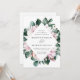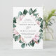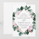 Elégante invitation à un mariage floral avec vos détails mariages entourée d'un cadre géométrique de fleurs de magnolia rose aquarelle et de feuilles d'eucalyptus verts. L'envers des invitations de mariage magnolia est doté d'un solide arrière - plan vert eucalyptus. Conçu pour coordonner avec notre collection de mariages Magnolia & Eucalyptus.