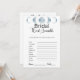 Ajoutez une touche céleste à votre douche nuptiale avec notre minimaliste Moon Phases Celestial Blue Collection jeu, "Bridal Word Scramble". Ce jeu est une façon amusante et stimulante de divertir les invités en démêlant des mots liés aux mariages et à l'amour. Le design est d'une esthétique simple et nette, avec un décor blanc propre qui renforce le thème céleste. En haut de la carte de jeu, les cinq phases de la lune sont affichées dans une belle couleur bleu clair, ajoutant une touche céleste au design. Le jeu comprend 10 mots pour les invités à se débrouiller, chacun en rapport avec les mariages, l'amour, et la mariée et le marié. Le verso de la carte de jeu comprend le nom de la mariée, la date de la douche de la mariée, qui a accueilli la fête, et la clé de réponse, ce qui permet à l'hôte de vérifier facilement les réponses des invités. Que vous soyez un amateur de ciel nocturne, un passionné d'astronomie ou tout simplement un amateur de la beauté de la lune, ce jeu est parfait pour ajouter un élément amusant et mémorable à votre douche nuptiale. Le design minimaliste de cette carte de jeu facilite la coordination avec votre décor de douche nuptiale et d'autres objets célestes. Que vous soyez l'hôte d'une douche nuptiale traditionnelle ou d'une célébration plus moderne, ce jeu complètera votre thème magnifiquement. Préparez-vous à vous amuser avec notre minimaliste Moon Phases Celestial Blue Collection jeu de douche nuptiale, "Bridal Word Scramble".