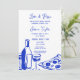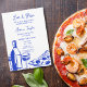 Unique bleu cobalt Main dessinée Contemporain Rétro Français Amusant Invitation avec un cadre arc, une oeuvre d'art fantaisiste et tendance pour votre mariage français par Savanamm et texte "amour et pizza"