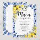 Main Squeeze lemon bridal shower invitation with blue tile design, citrus lemons, and floral details. Ideal for lemon themed bridal shower ideas, lemon and blue bridal shower theme, and Italian bridal shower celebrations.