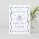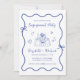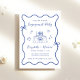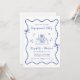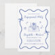 Invitation à la fête de fiançailles mariages d'inspiration rétro avec un cadre ondulé bleu français unique orné de coquettes et d'illustrations fantaisistes dessinées à la main de coeurs, d'étoiles et d'une élégante table romantique. "Engagement Party" et les noms de la mariée et du marié sont présentés dans un joyeux script bleu.